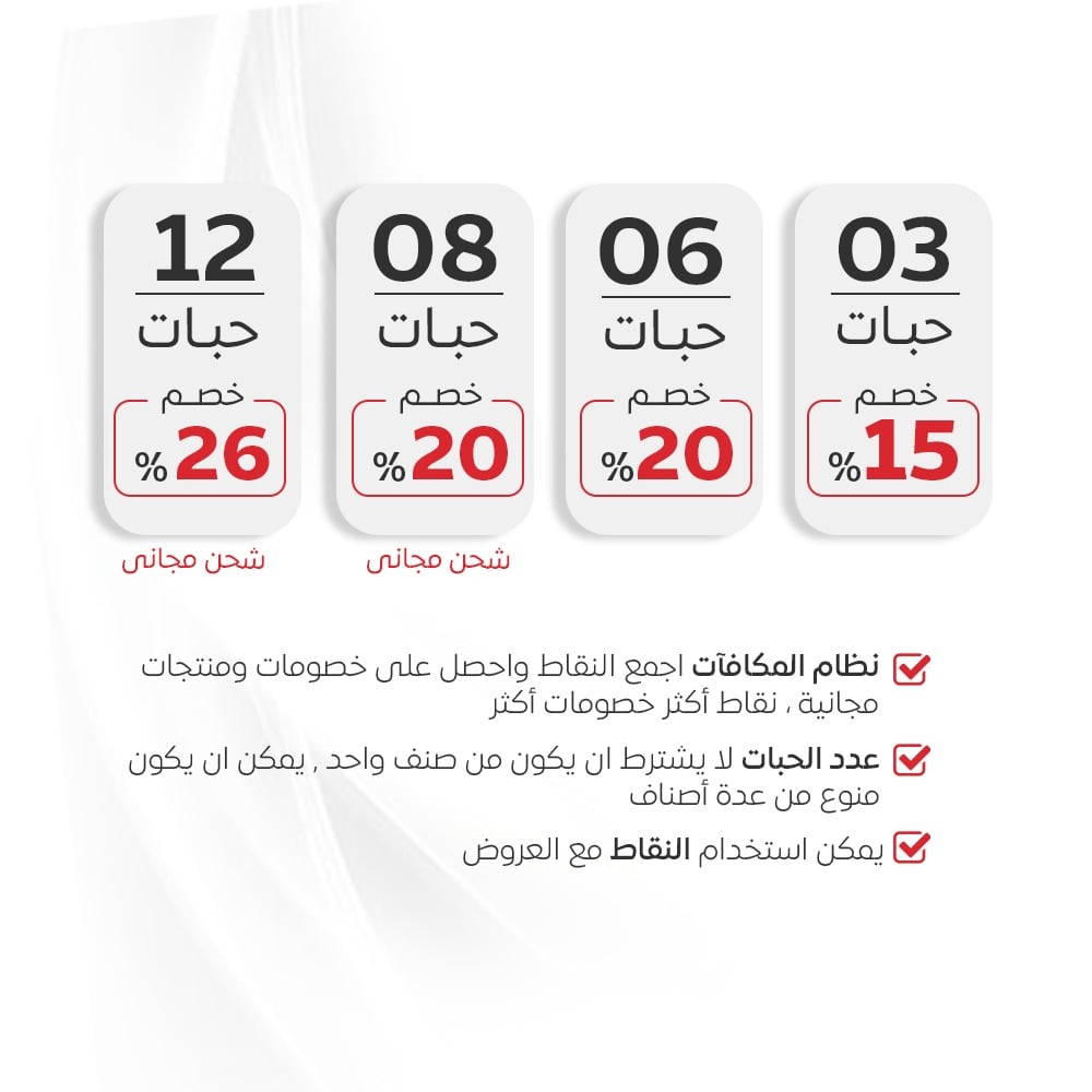 - ☑️عروض مع خصم خاص لكل مجموعة (3 حبات، 6 حبات، أو 12 حبة) للاستفادة من الخصومات المخصصة لكل عرض.